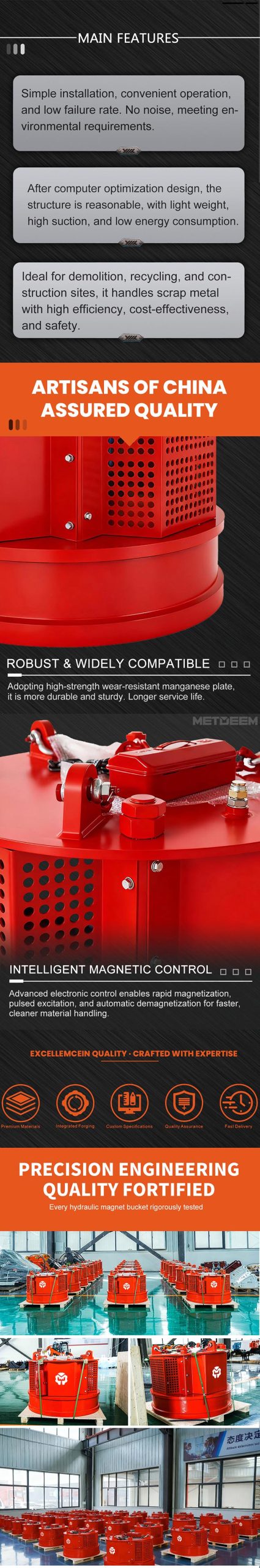 Imán hidráulico Metdeem es adecuado para la adsorción plana de barras de acero, chatarra de hierro, así como para vehículos desechados, barcos, estructuras de acero, etc.