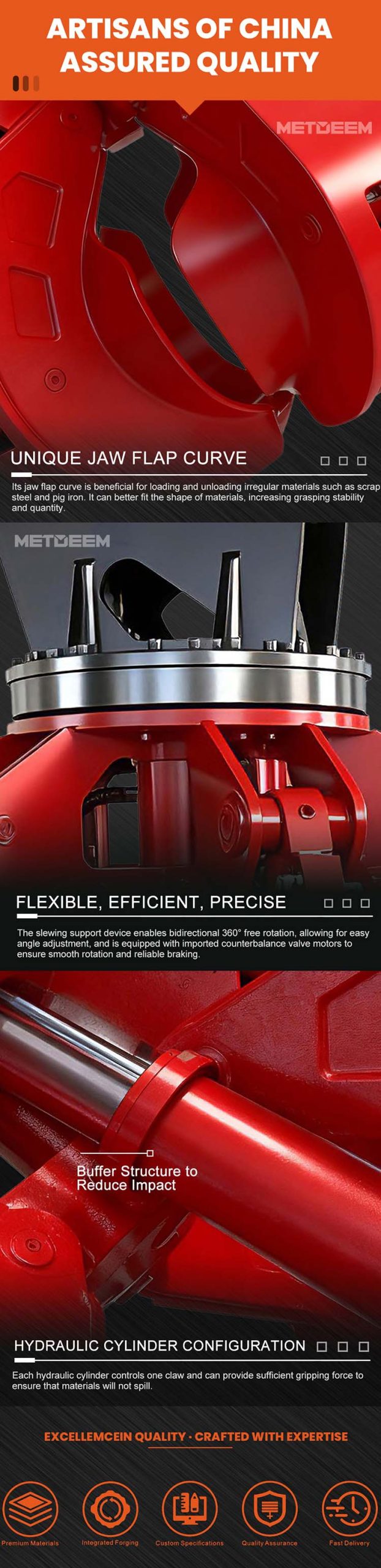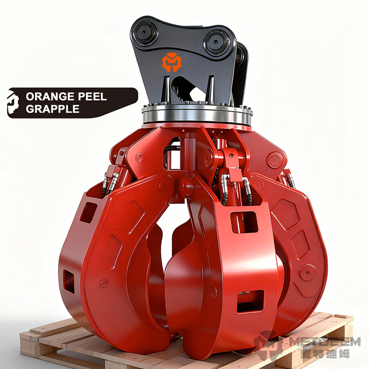METDEEM Orange Peel/Lotus Grabber is an “intelligent and flexible hand” for handling loose and fragmented materials. Its multi-petal design is like a blooming lotus. When it closes lightly, it can grasp a large amount of stone materials, wood chips, thin steel, etc., and the closure is tight without any spillage.