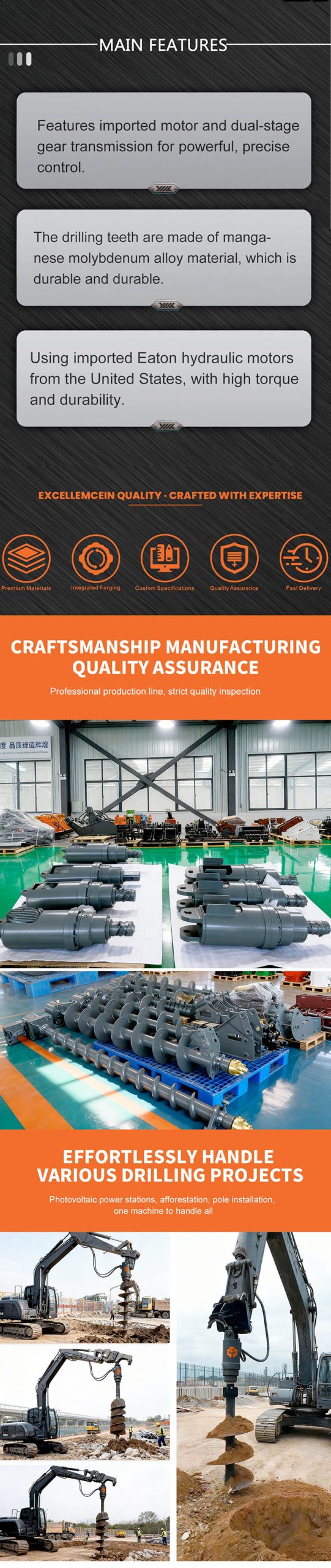 ♣ Permintaan daya tahan tinggi dan biaya pemeliharaan rendah pada peralatan hidrolik digabungkan dalam desain total Excavator Auger Drill Attachment kami.