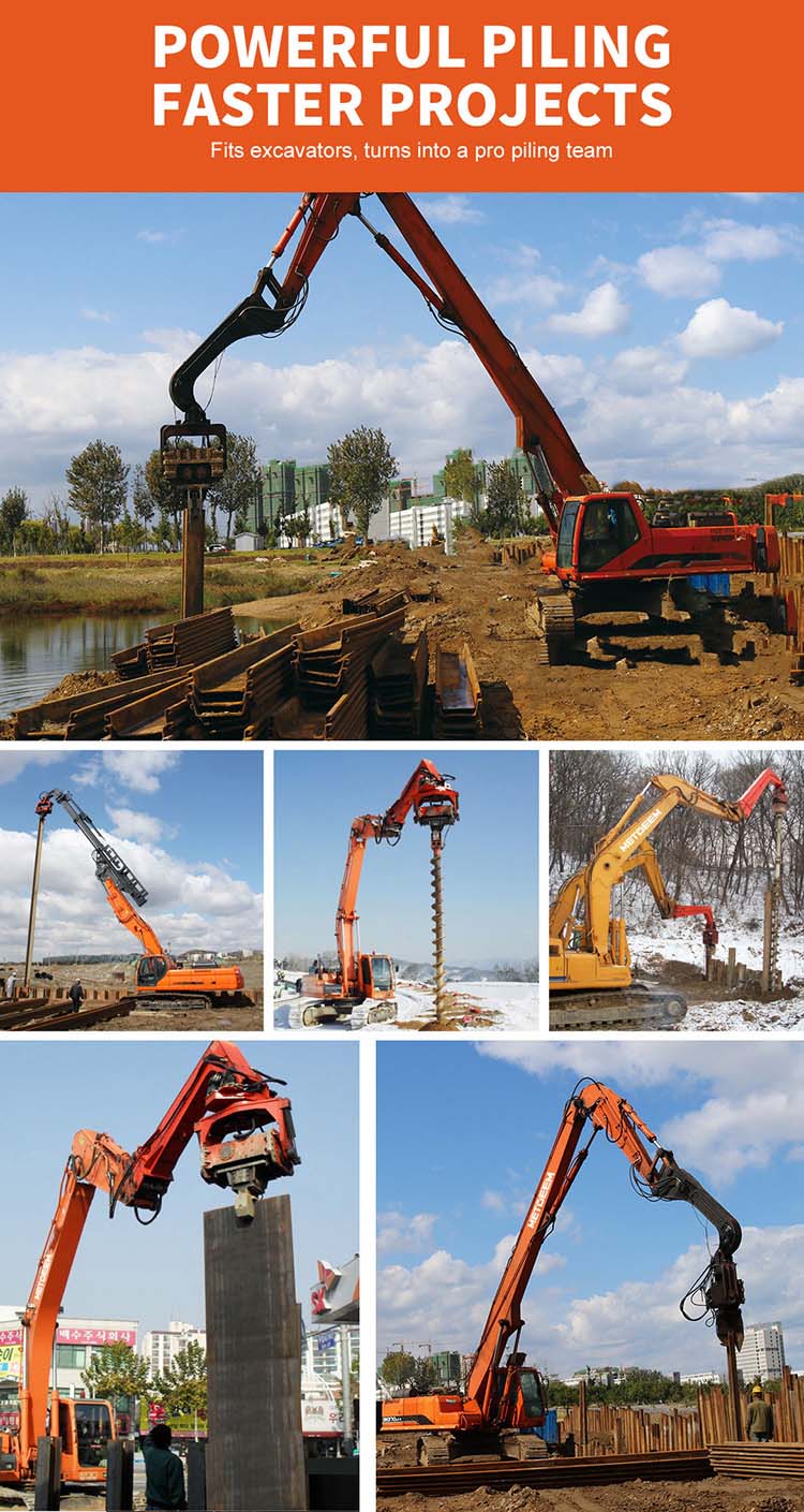 *Then consider the size of your excavator: Select a matching model based on the weight of your excavator. Generally, small excavators (1-8 tons) are suitable for being paired with light pile drivers to handle photovoltaic piles. For large excavators over 10 tons , models with greater excitation force can be selected to handle engineering piles.