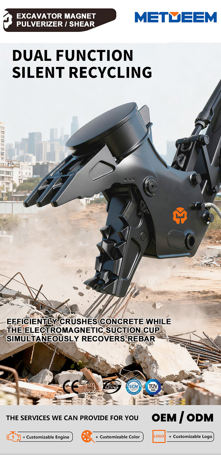 Metdeem Excavator Magnet Pulverizers are used for separation of reinforced concrete,concrete block crushing,construction waste recycling.